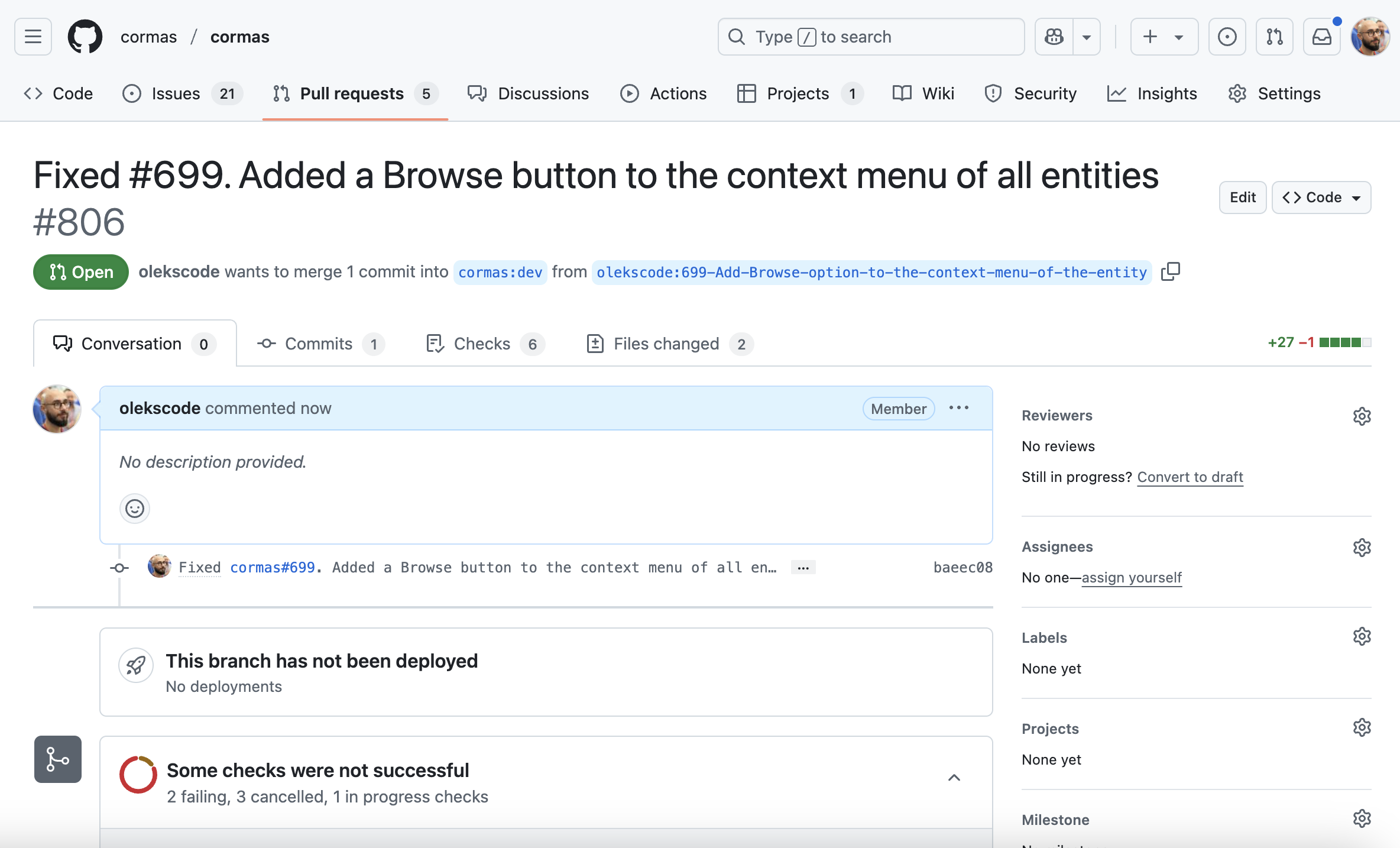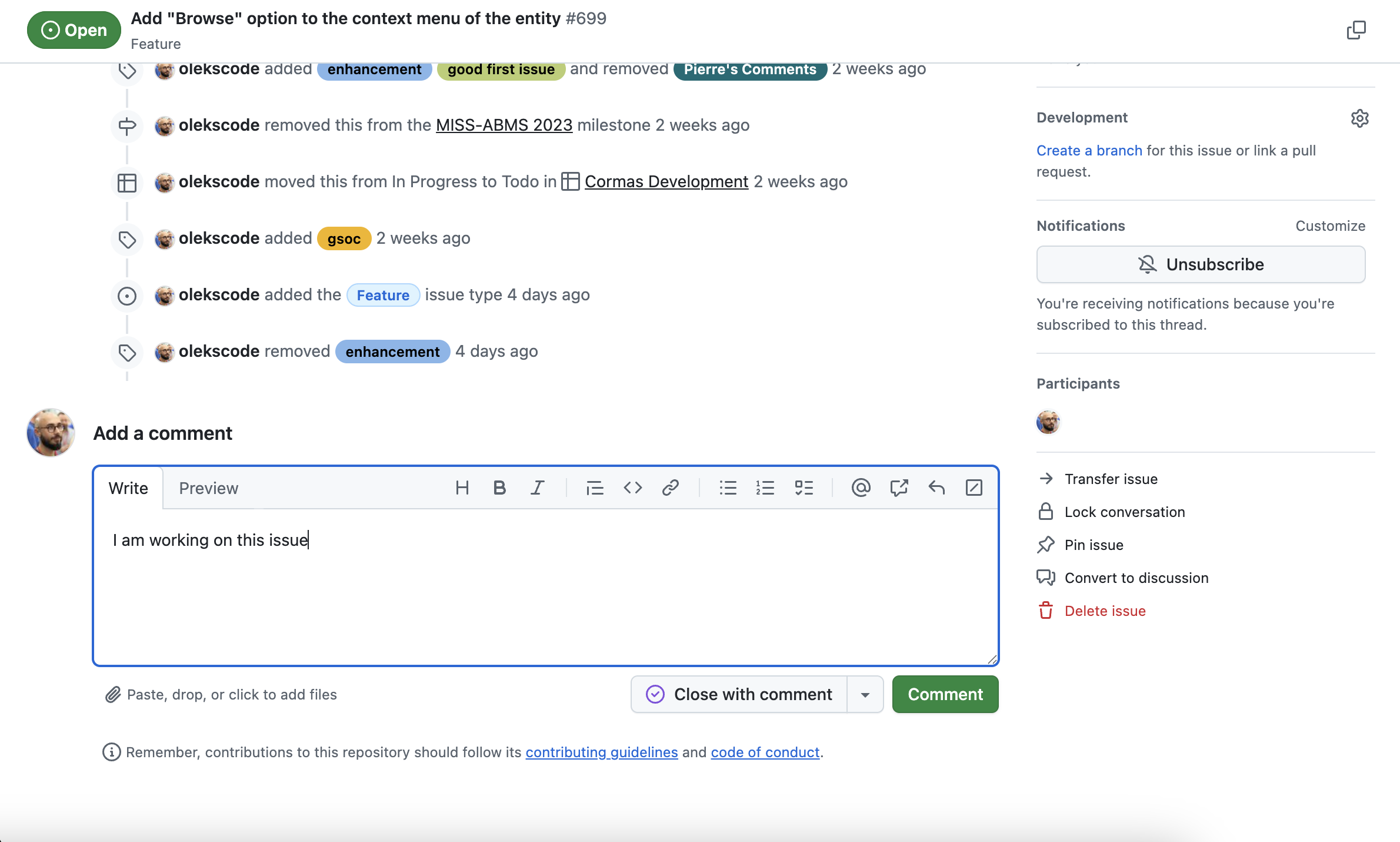 In this tutorial, I will be working on issue #699 which asks to add a "Browse" option to the context menu of the entity. I click on the issue, read its description and the discussion section. Then I leave a comment indicating that I am working on it. This will prevent other contributors from taking on the same issue.