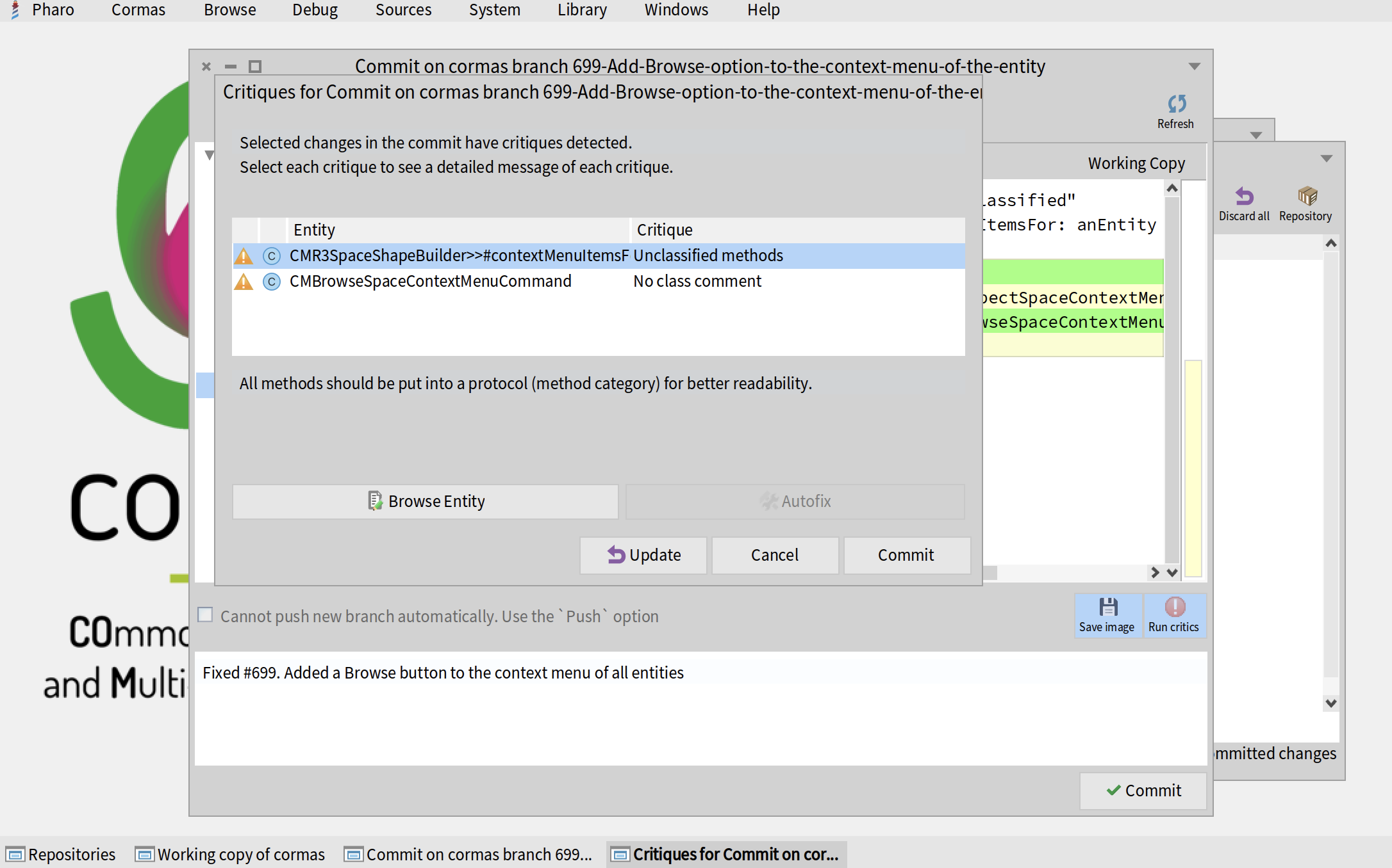 Carrefully go through the list of changes that you are about to commit. If there are some changes that are not supposed ton be included into this pull reques, make sure to uncheck them. Then write a meaningful commit message. If you are fixing an issue, it is a good practice to start your message with a special word "Fixed" followed by a space, a hash, and the issue number. For example, my message is "Fixed #699. Added a Browse button to the context menu of all entities". GitHub will automatically detect the "Fixed #699" part and close issue #699 as soon as your pull request is merged (accepted). Once you wrote your message, click on the "Commit" button in the bottom-right corner.