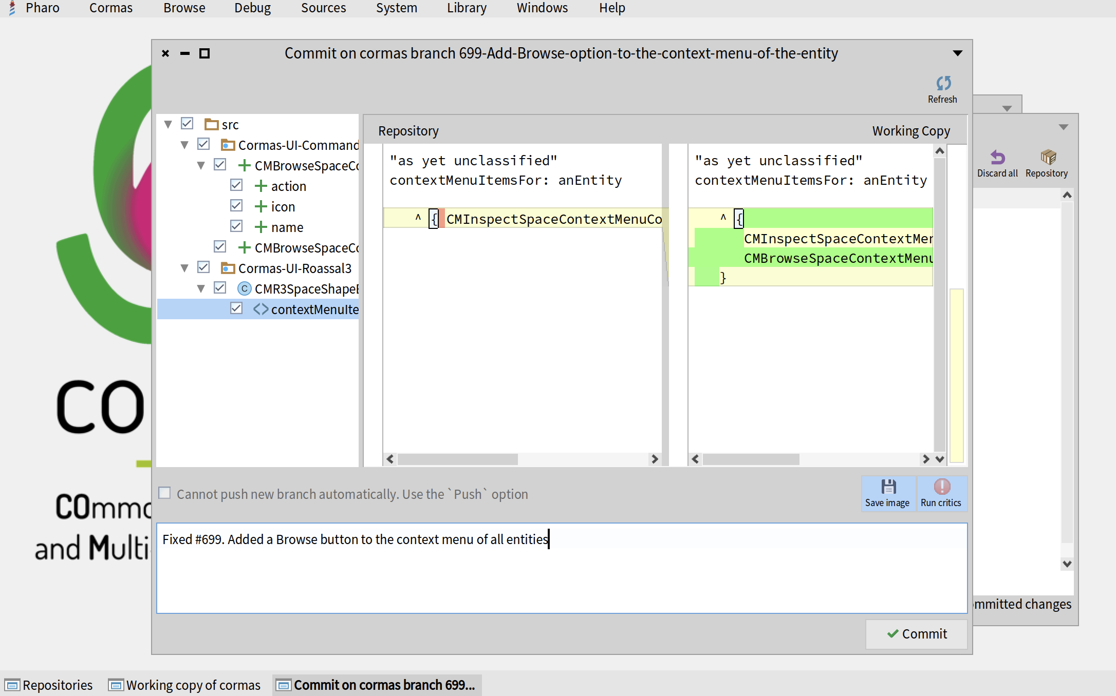 Double-click on cormas repository to see the list of packges. The ones that you modified will also be green. You can now click on the "Commit" button in the top-left corner.