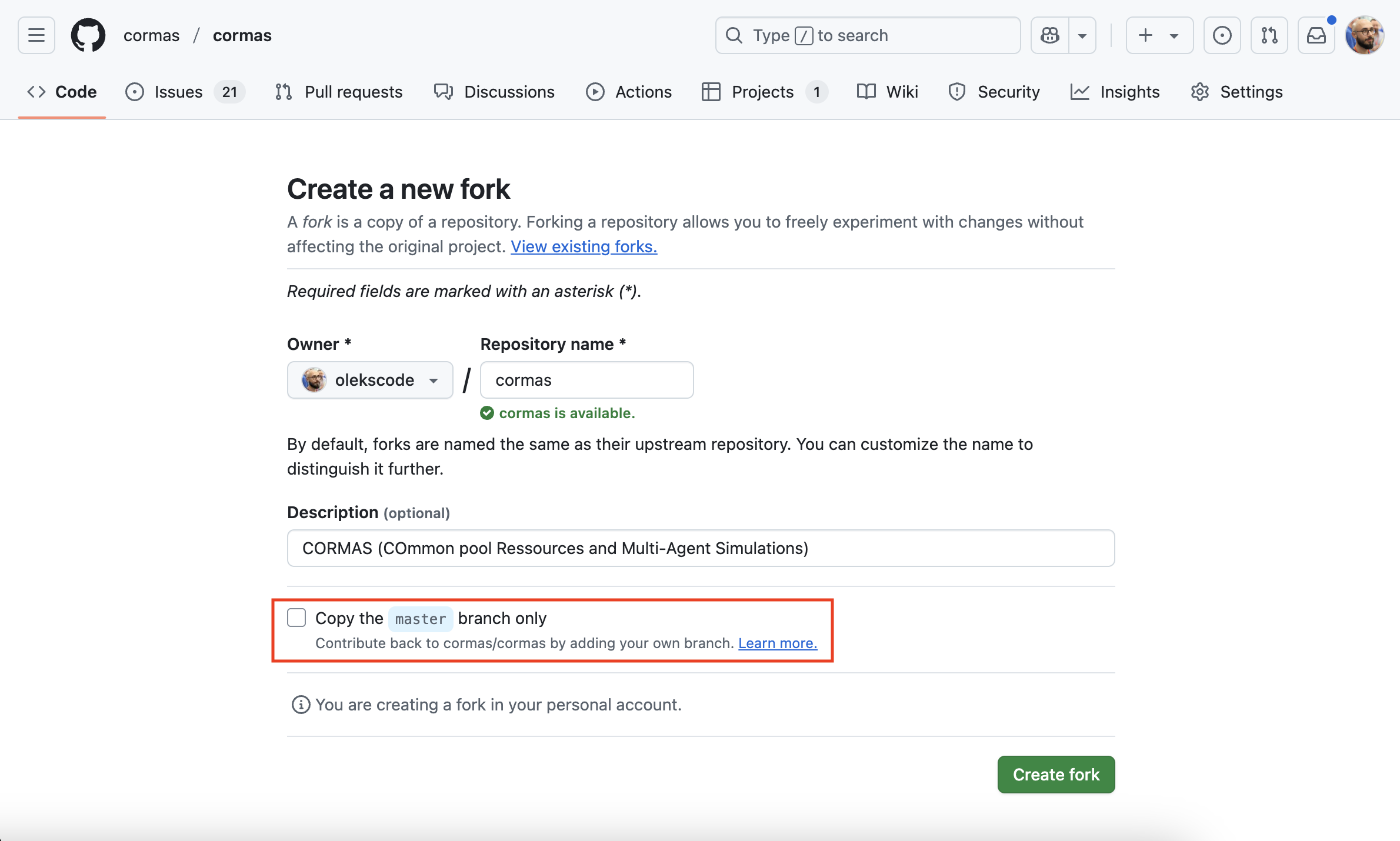 Since you don't have access to commit to Cormas repository directly, you must create a fork - a copy of this repository on your GitHub account. You will modify this fork and then submit the changes to the original repository as a pull request. We (Cormas developers) will review your proposed changes and either accept (merge) them or ask you to change something. You can create a fork by clicking on the "Fork" button in the top-right corner of our repository.