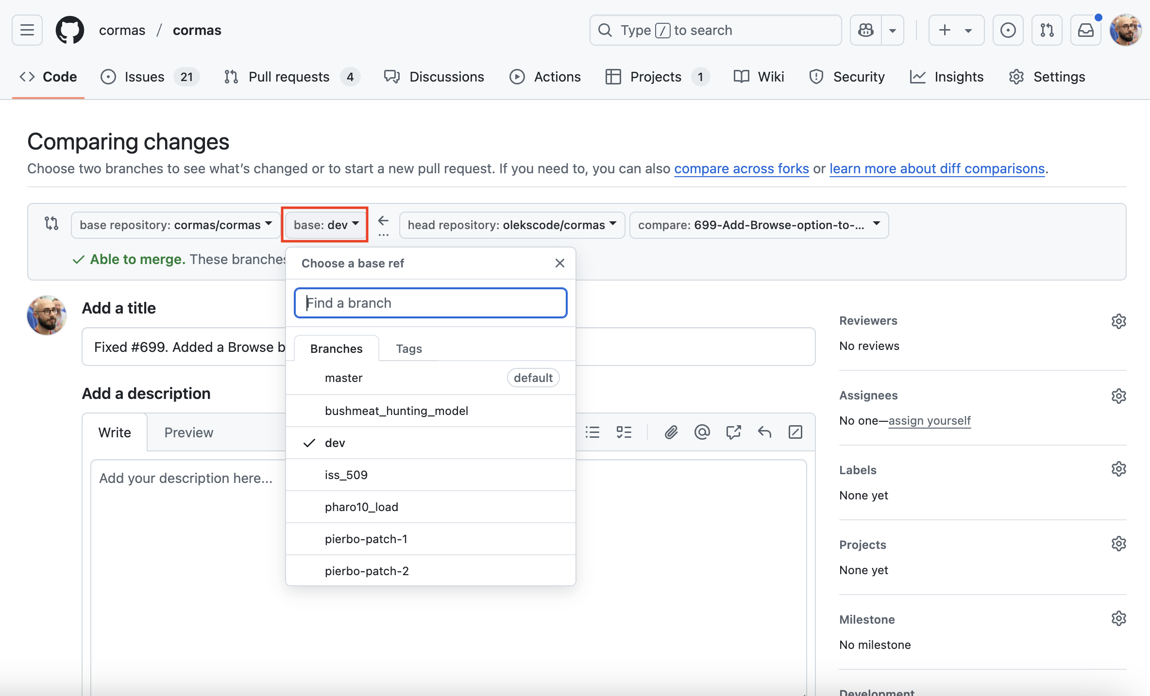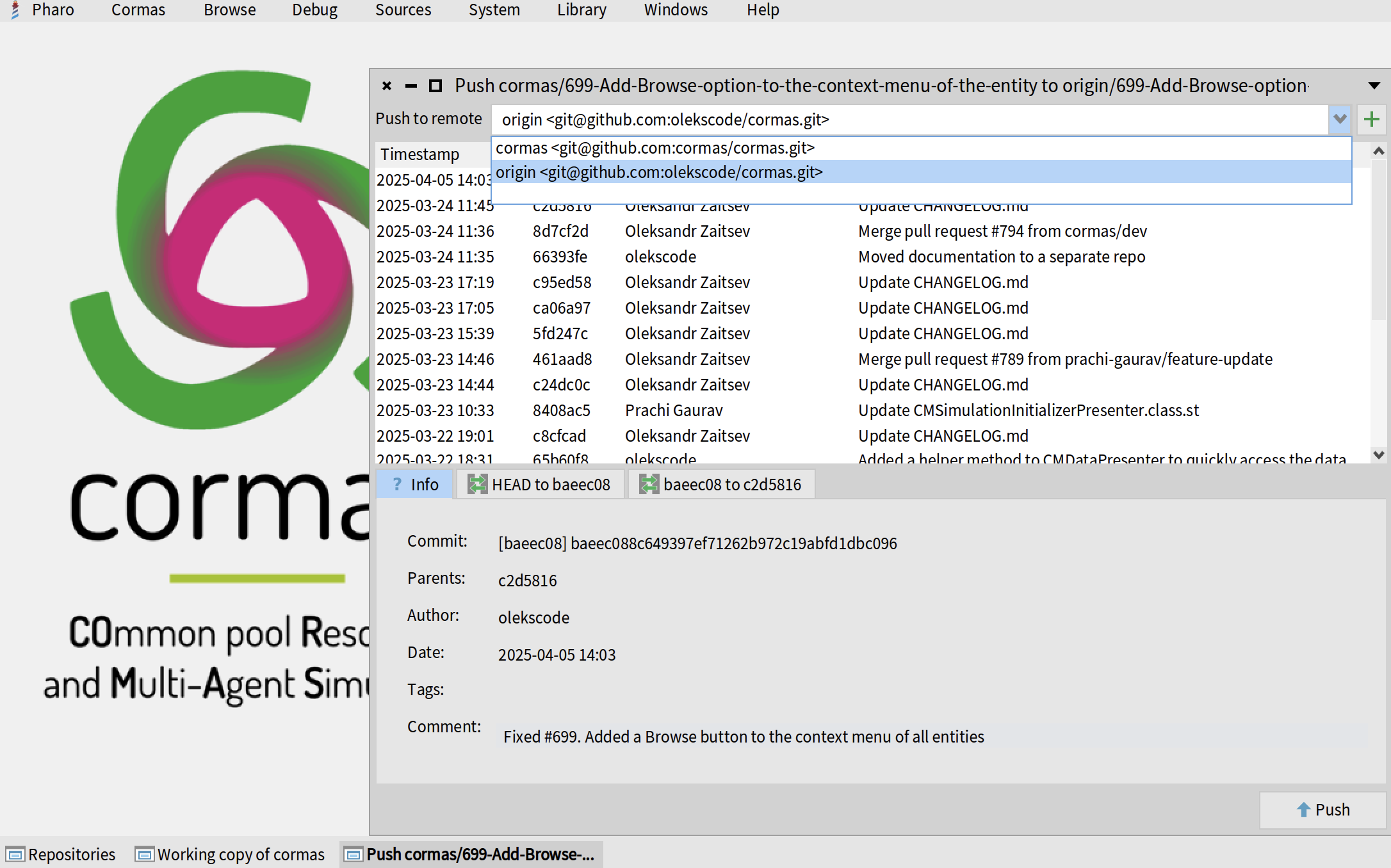 It is possible that while you make your changes, someone else will push their own changes to Cormas. Then you will be forced to pull those changes and resolve potential conflicts before pushing your own changes. To simplify this process, it is a good practice to create a separate branch for the issue that you are resolving and, once you are done, make a pull request merging this branch into the original branch (dev).