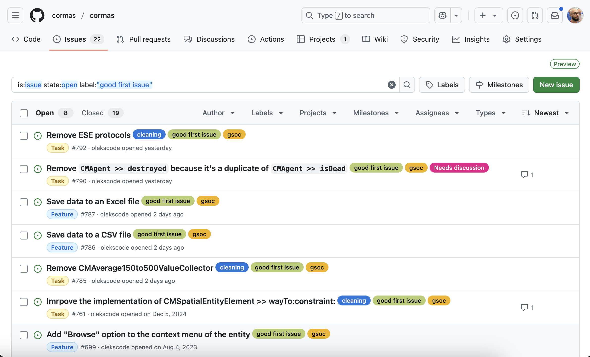 You will see the list of open issues. Most issues will have one or multiple labels associated with them. If you are a newcomer, we recommend that you start with good first issue label. Those issues are selected by experienced developers as a recommended practice for new contributors. They are usually small and easy to resolve.