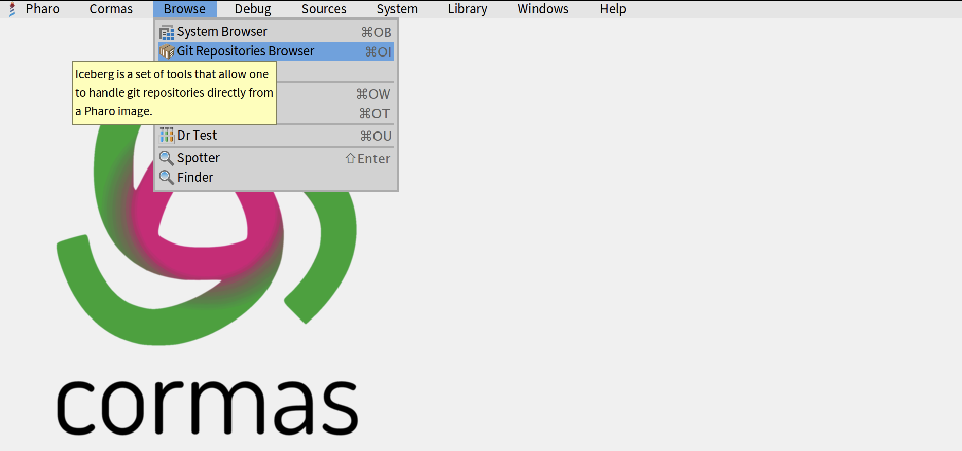 Now we must specify the location of our SSH keys to make sure that Pharo image can authenticate to GitHub and make commits from your account. If you don't have the SSH keys yet, please follow the Generate SSH keys step of our GitHub tutorial. Click on "Browse" in the world menu and then on "Git Repositories Browser" (a tool also known as "Iceberg").
