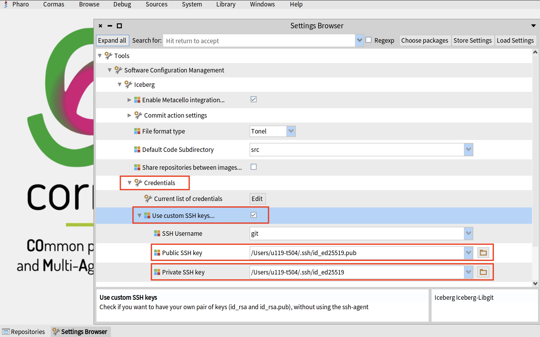 In the settings browser, select "Credentials", check the "Use custom SSH keys..." checkbox and make sure that both public and private SSH keys point to the correct location on your computer. Now you can close the settings browser, your changes will be automatically saved.