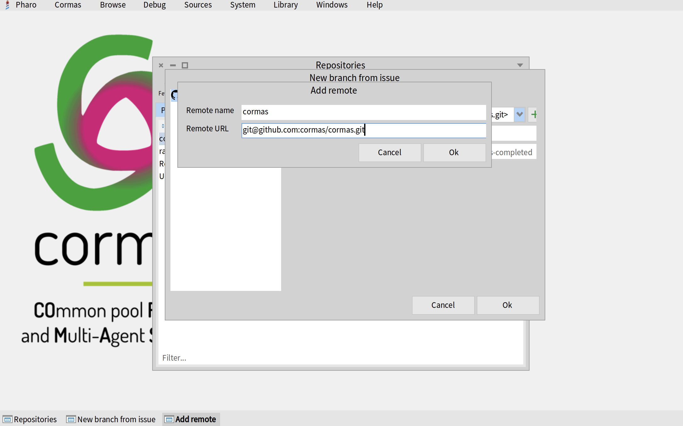 Now give the name to your remote. I call mine "cormas" but you can choose any name that you like. Remote URL should be the SSH address that you copy on GitHub. For Cormas repository it's "git@github.com:cormas/cormas.git". Once you have completed both fields, click on the "OK" button.