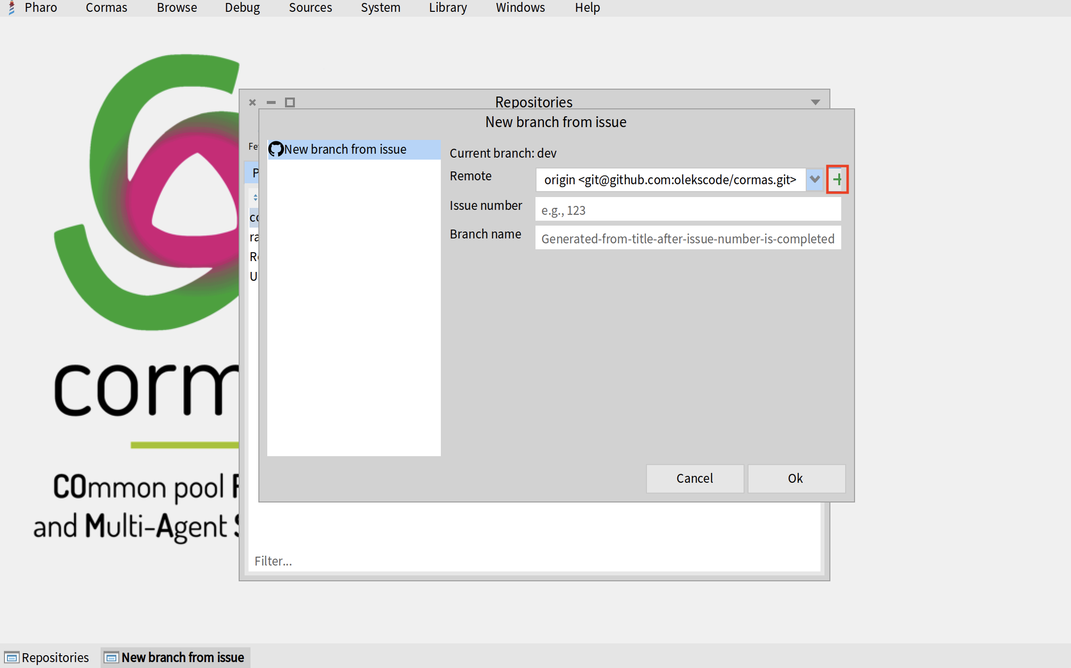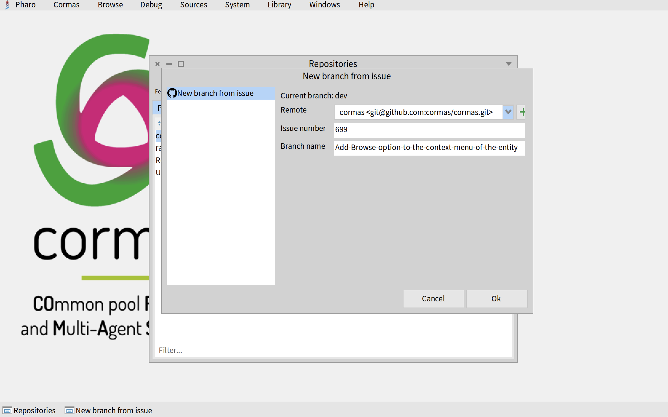 Now you can select Cormas repository from the list of remotes. Write the issue number in the second field. The number of my issue is 699 - it's the issue that I selected in the Select an issue section of this tutorial. If you did everything correctly, the branch name field will be auto-completed with your issue title that will be automatically retrieved from GitHub.