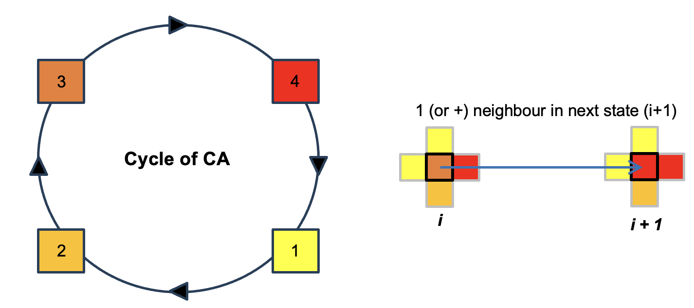 A cell moves from a state i to a state i + 1 (mod 4) in the state cycle when the state i + 1 (mod 4) is present in at least one neighboring cell.