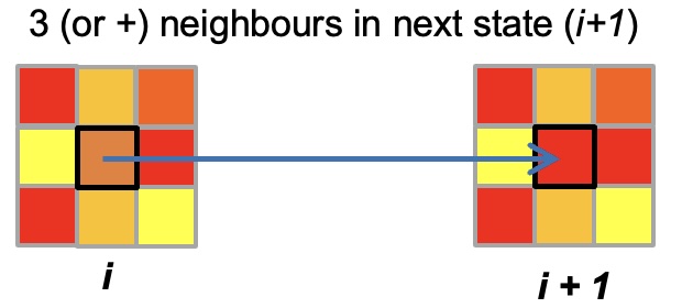 The current cell in state i checks its state against the neighbors' states. If 3 (threshold) or more neighbors have a state between (i+1) and (i + nbStates/3), then the current cell changes to that state. For example, if the current cell state is 2, and 3 of its neighbors are in state 3 to 6, then the current cell changes its state to 3: