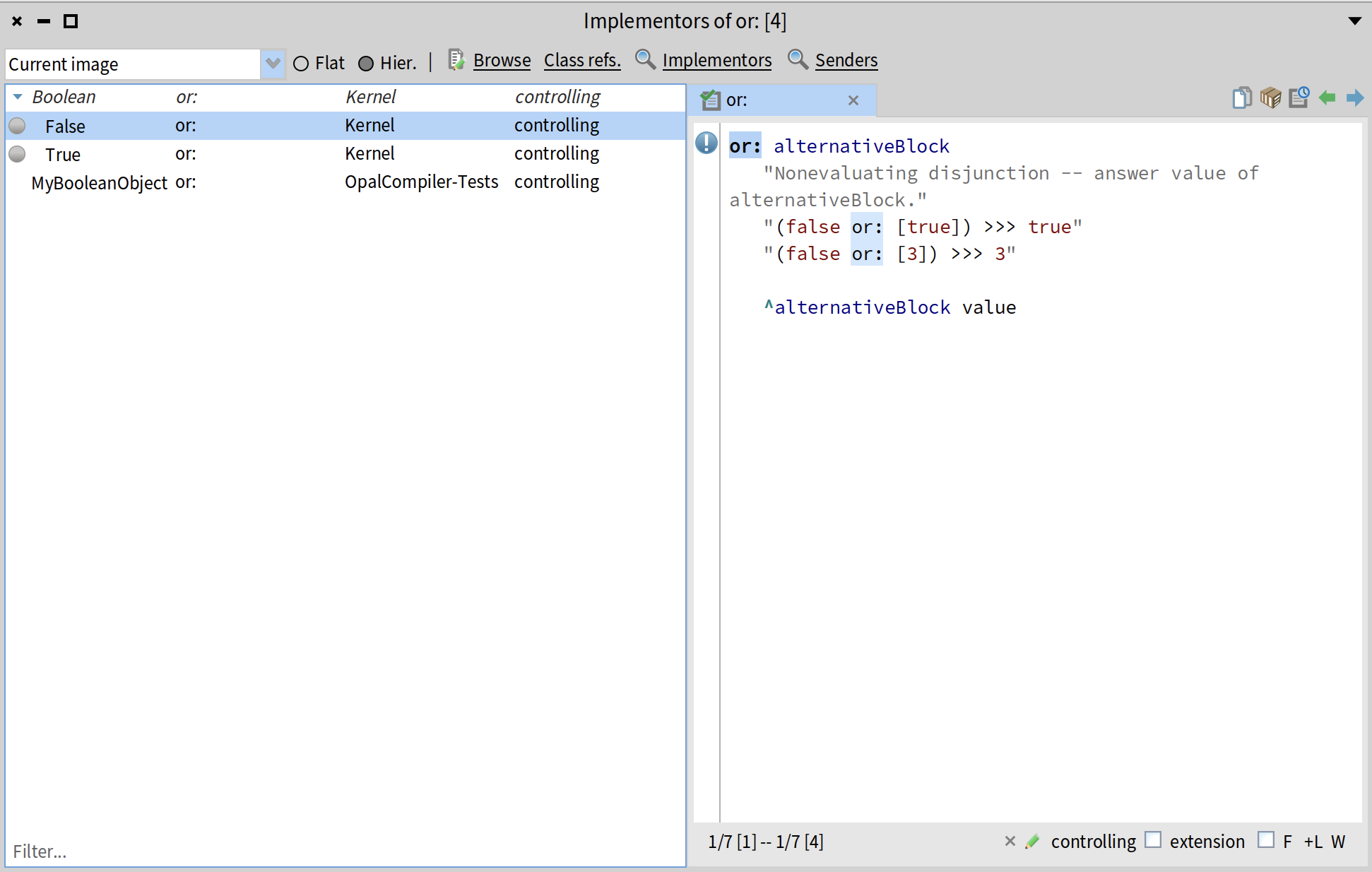 We can check all implementors of a given message by positioning our cursor on it and pressing "Ctrl+M" (or "Cmd+M" on Mac). This will show us all the methods that implement or: