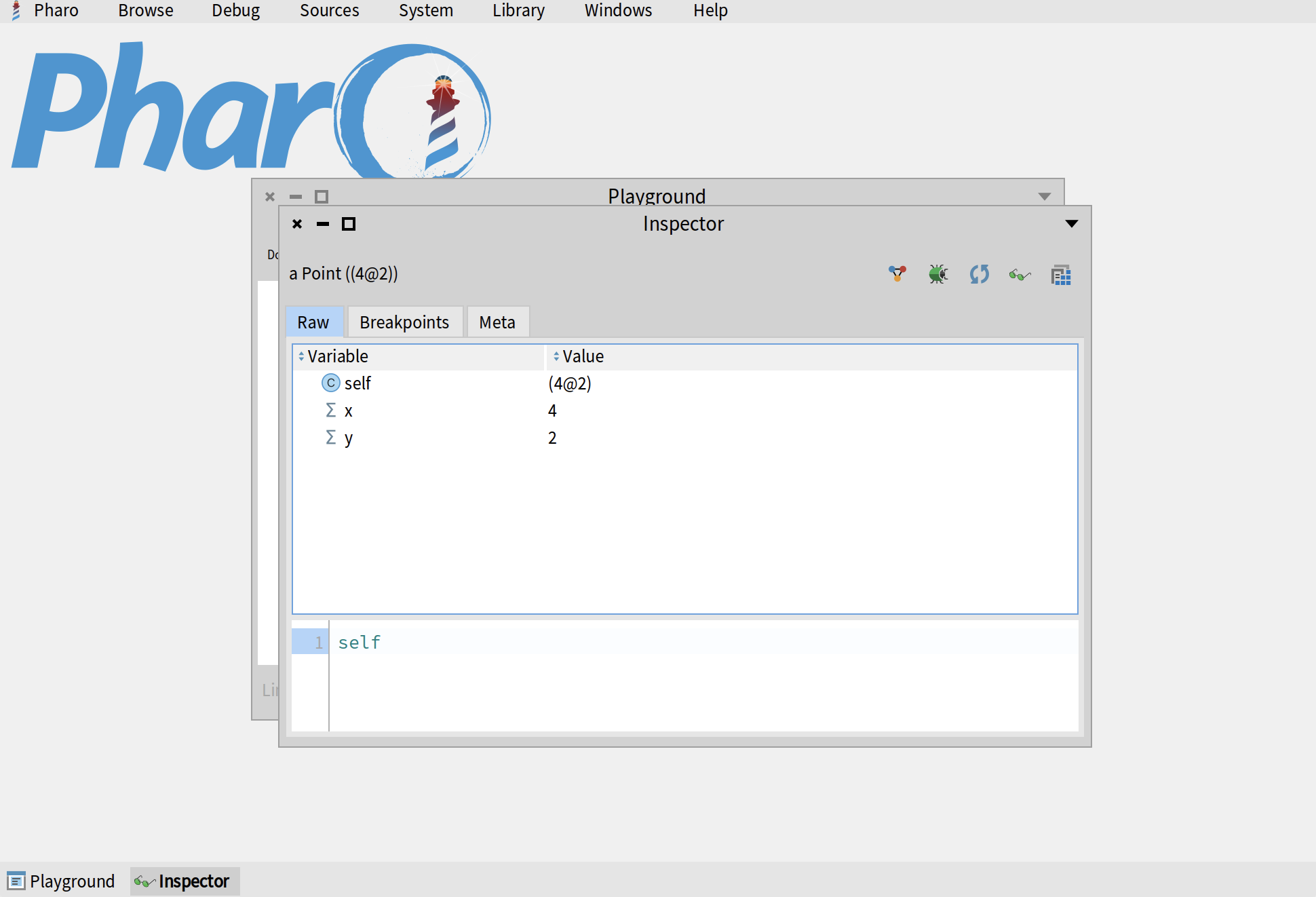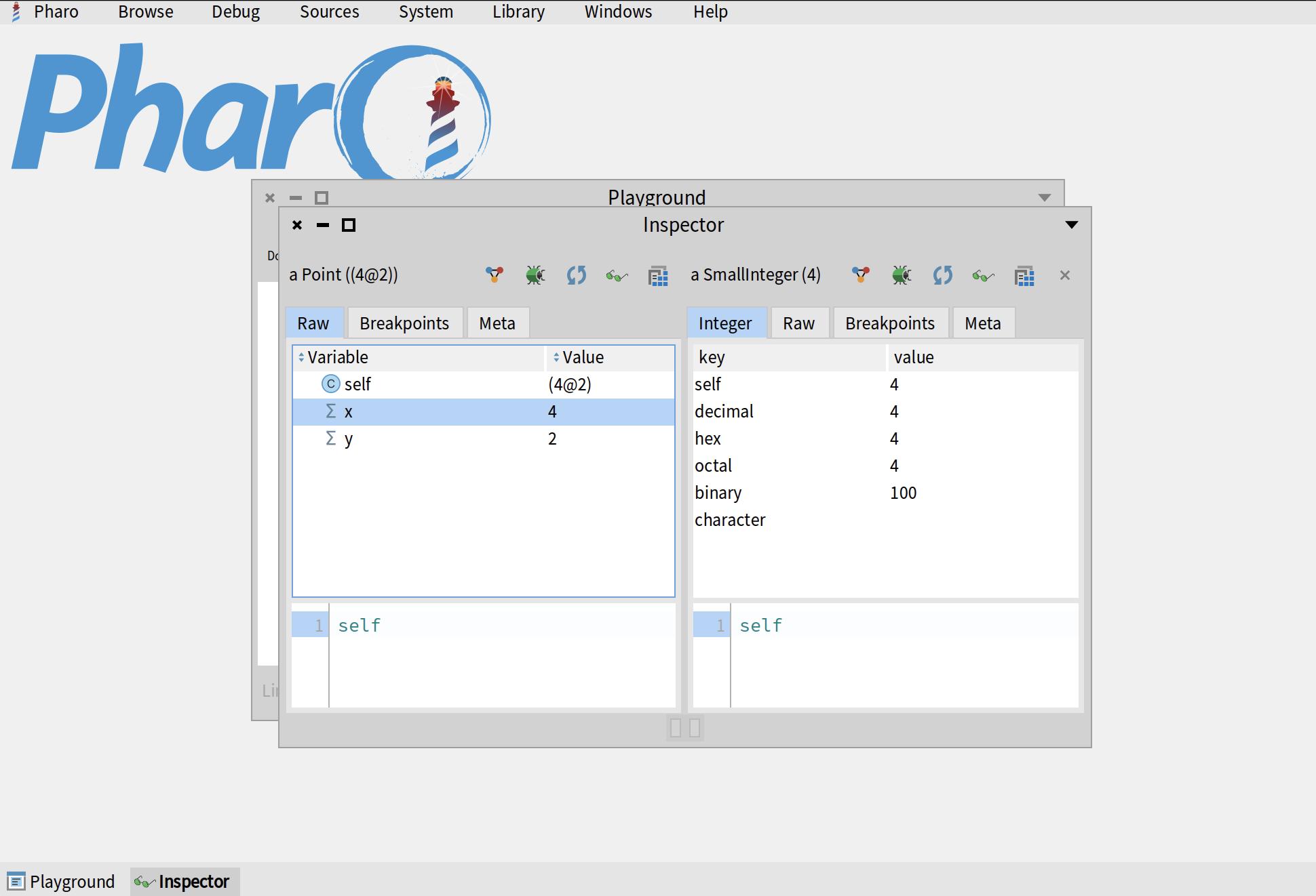 and open an inspector for this object. The default inspector tab is called Raw. It shows you the names and values of all instance variables. In our case, the object has two variables: x