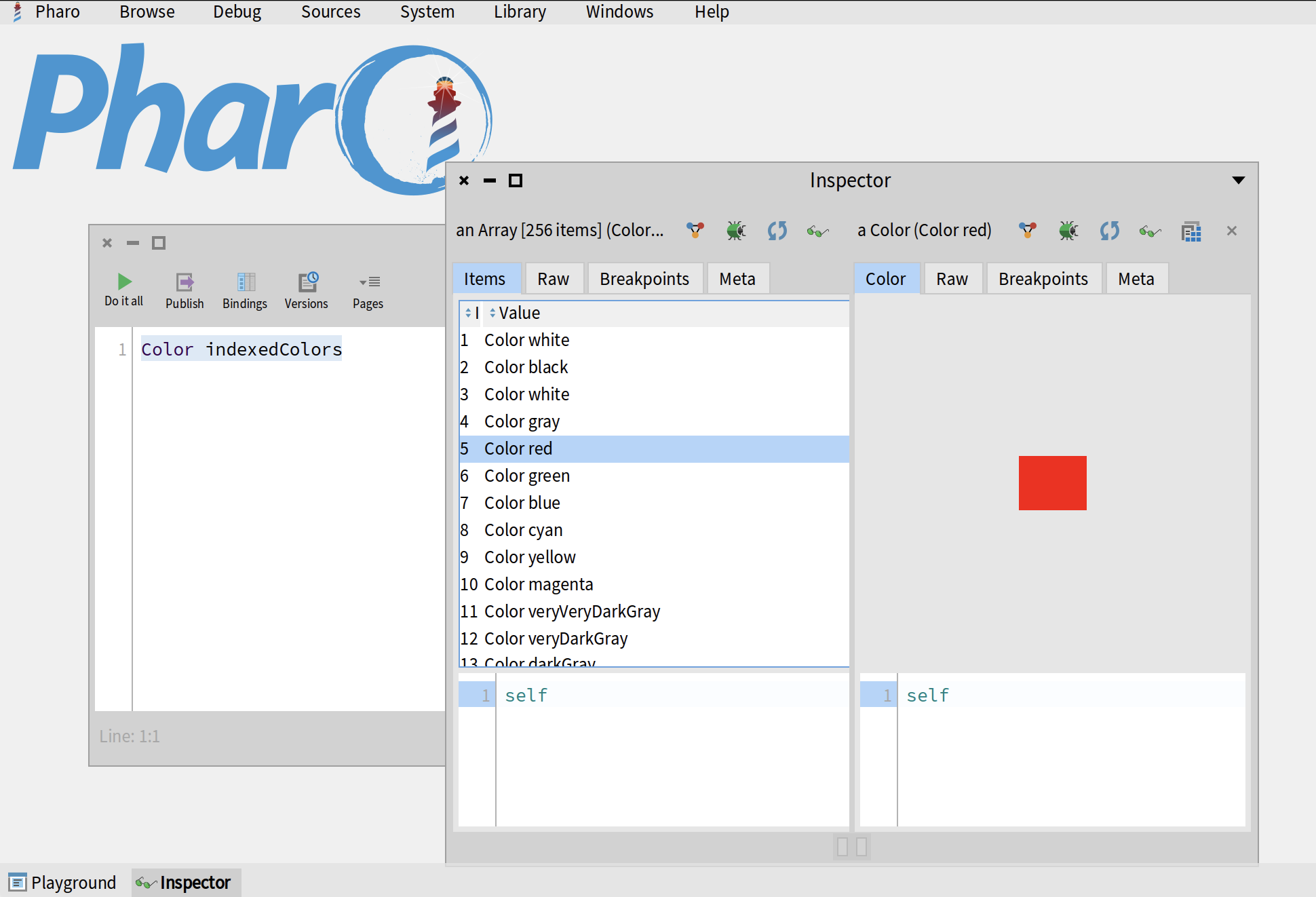 The second important tool that you must learn is called "Inspector". It is a window that represents an object. The default inspector will show you the propertioes of an object and allow you to interact with it by sending messages. You can also define custom tabs for an inspector to add custom representations (e.g., visualizations, tables, graphs, etc.) for your objects.