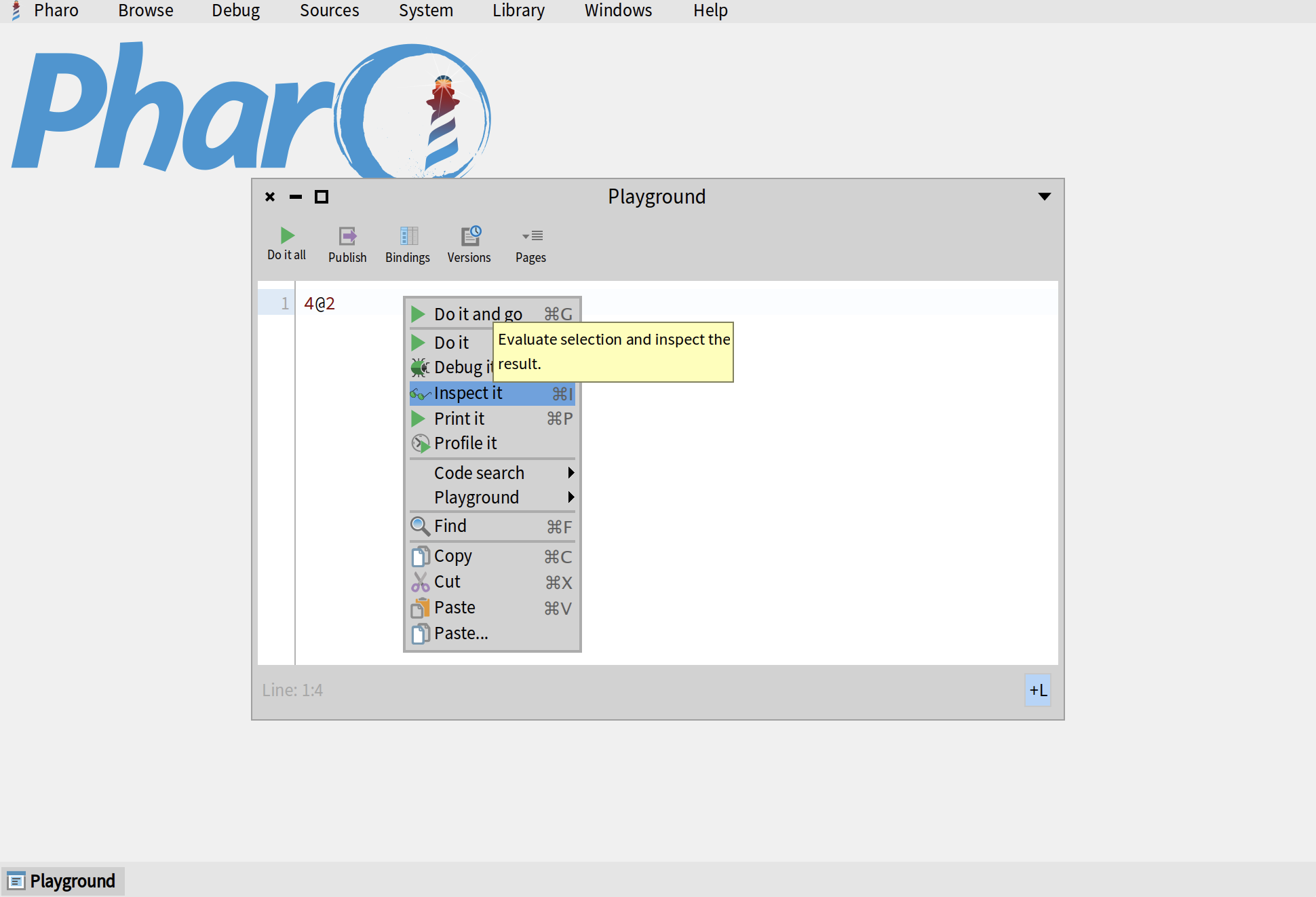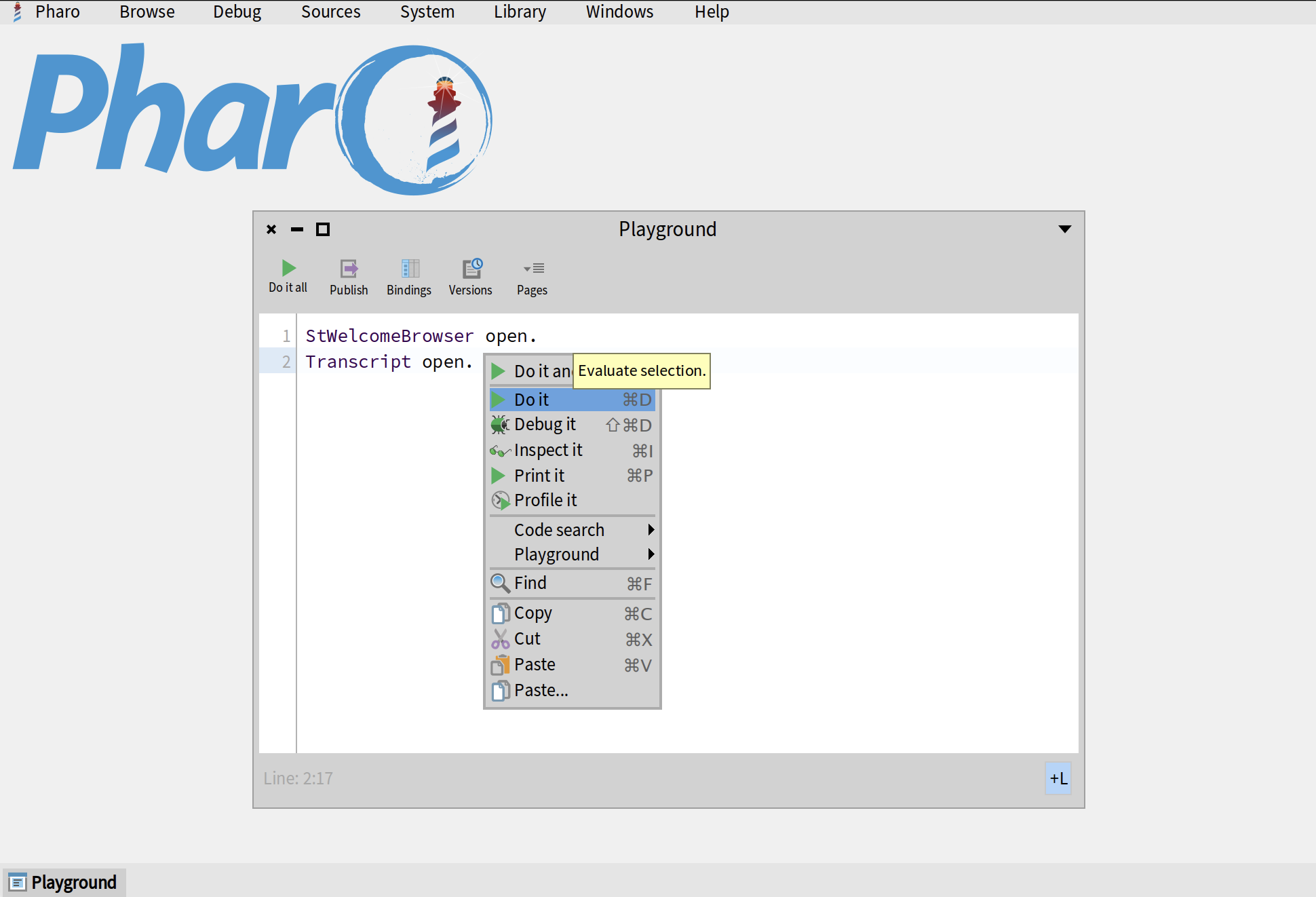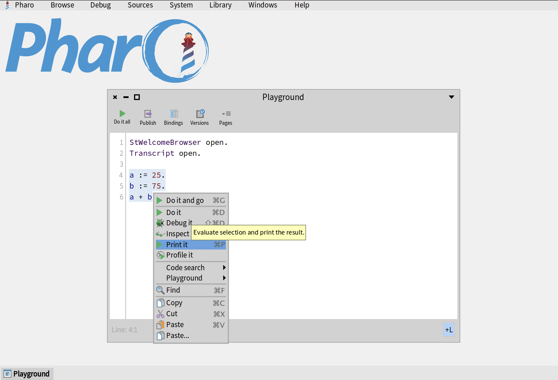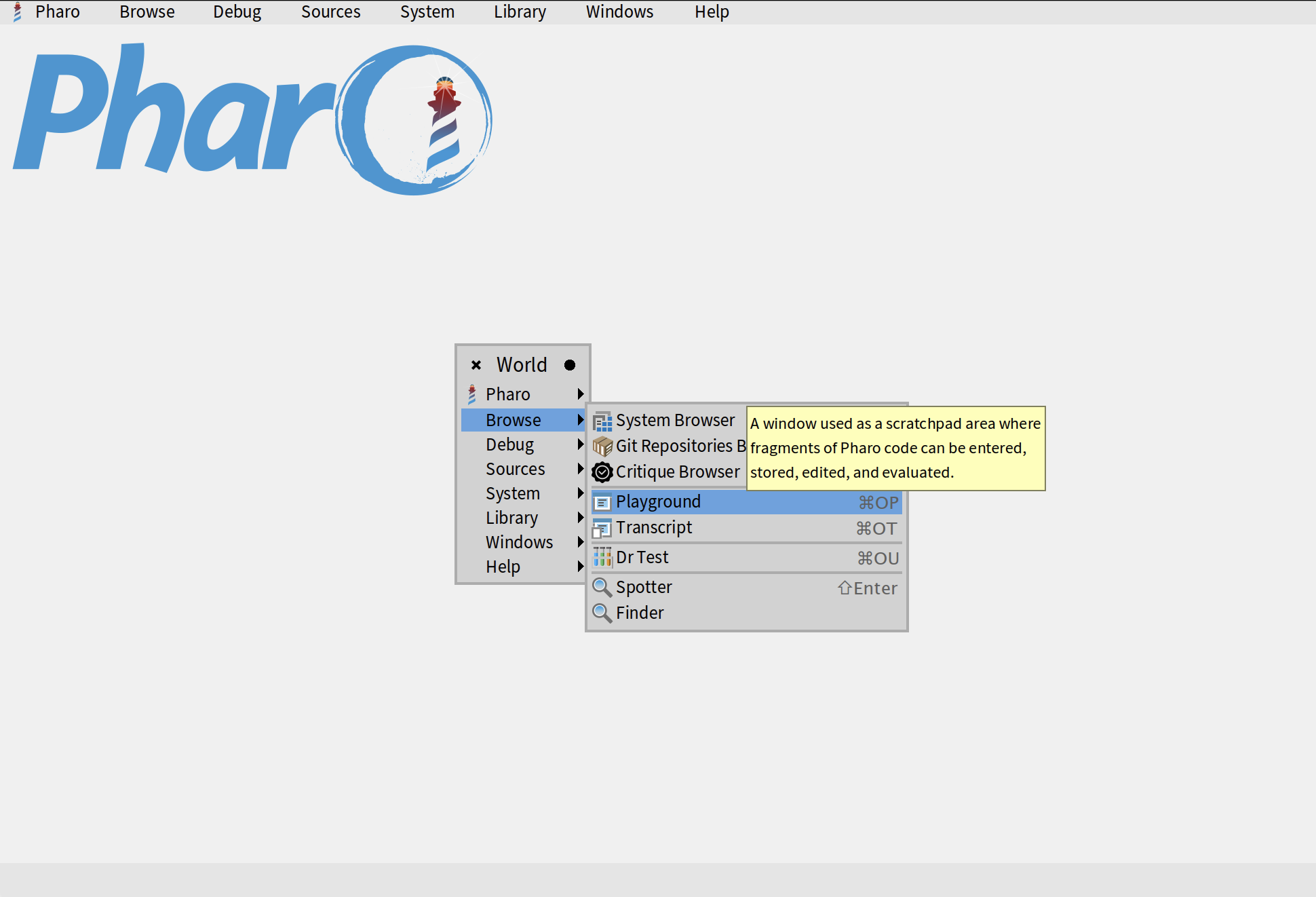 The first tool that you will learn is called "Playground". It allows us to execute code and try different code snippets. As a general rule, we don't program in Playground. As the name suggests, it is only used for trying out different things. The actual code is written in "System Browser", a tool that will be presented in the following sections. To open Playground, you can select Browse > Playground in your world menu. You can also use a keyboard shortcut Ctrl+OP on Windows or Linux or Cmd+OP on Mac.