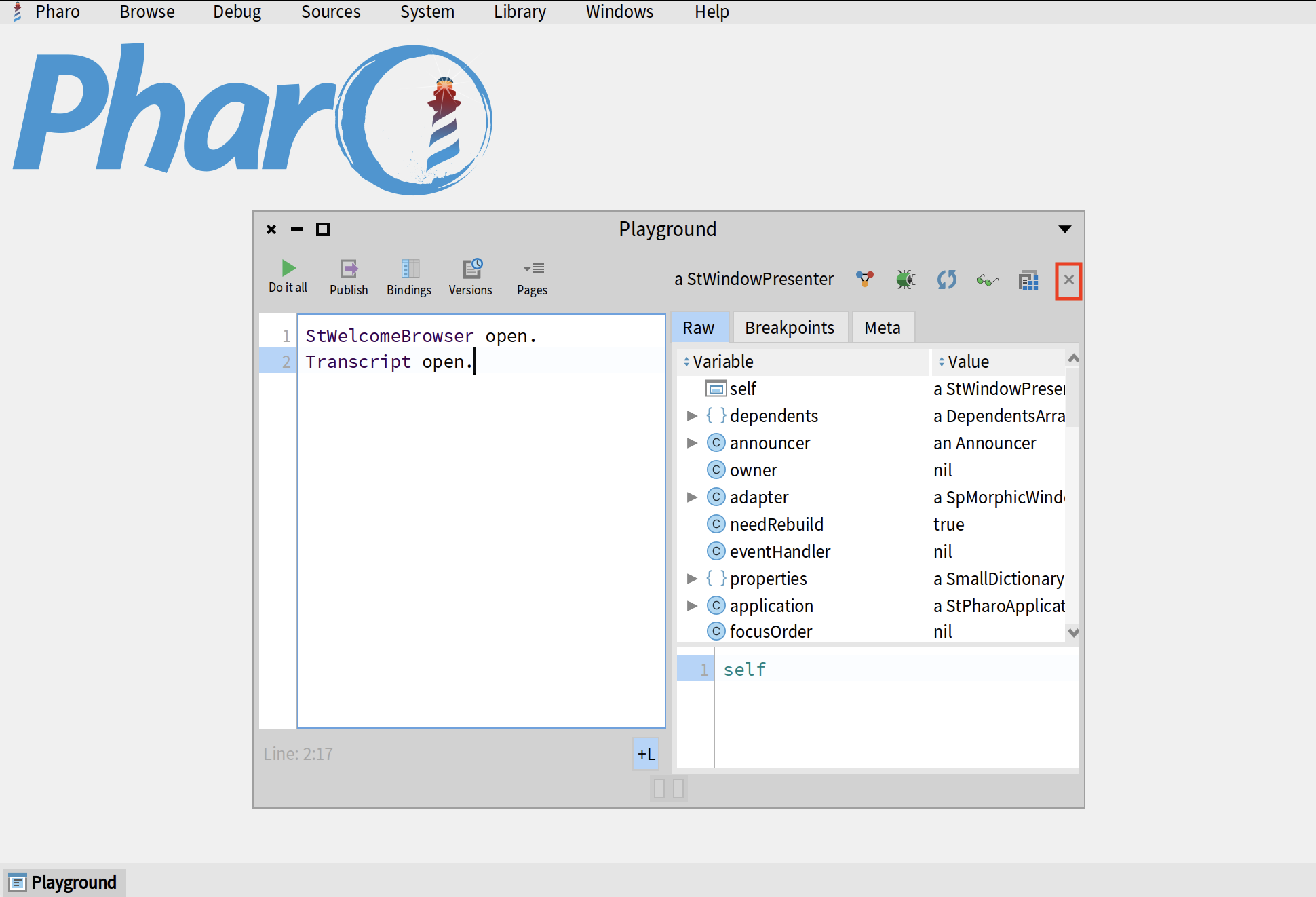 If you close the Welcome Window and want to open it again later, you can do so by clicking on About > Welcome to Pharo.