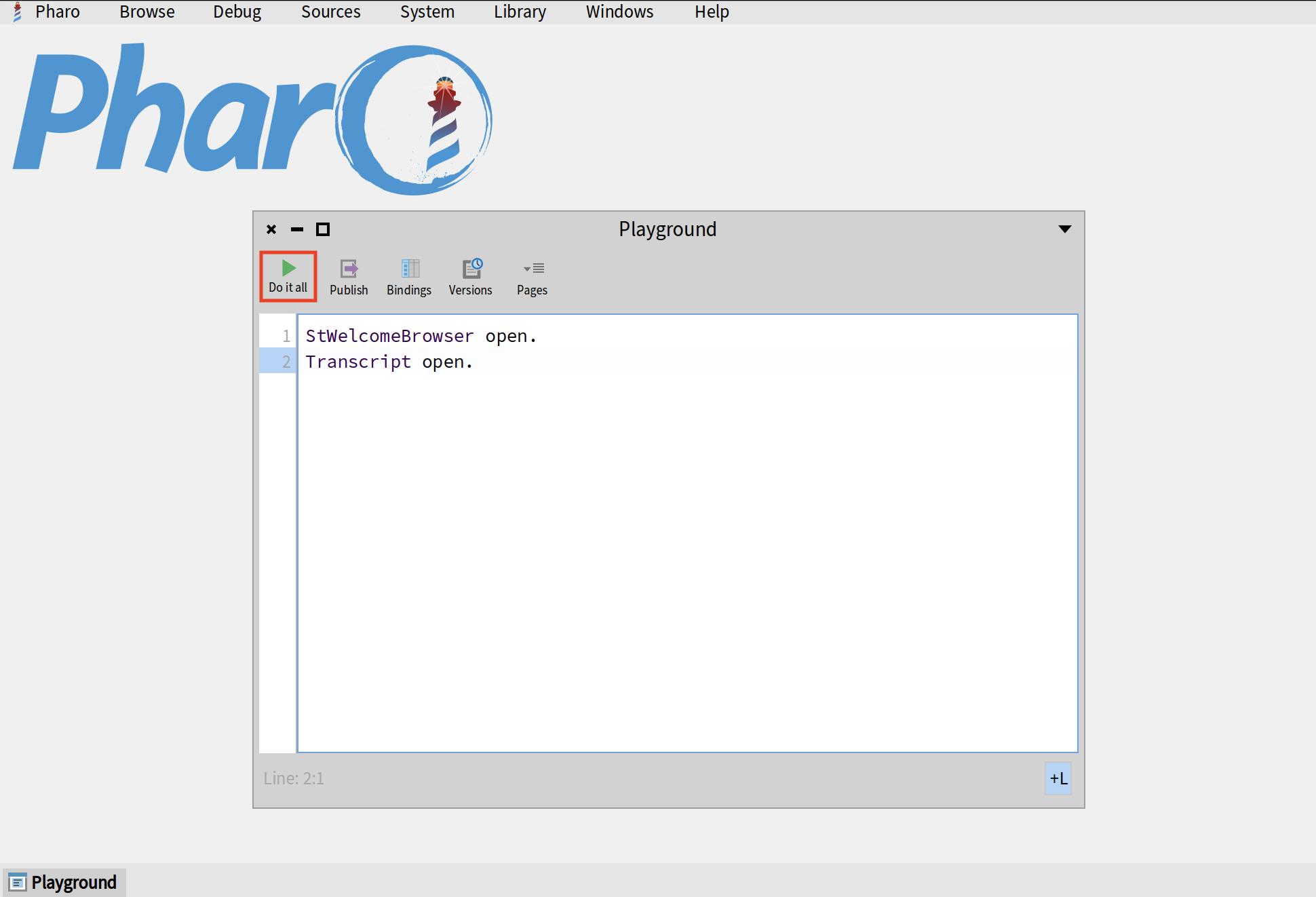 This button executes the entire contents of your Playground. In this case, it will execute two lines that we wrote: first it will open the Welcome Window, then it will open a Transcript (another tool that you will learn in the following sections). "Do it all" button will also open an inspector in the right half of your Playground on the object returned by the last line. We will explain Inspector in the next sections. For now, you can just close it by clicking on the little cross in the top-right corner.