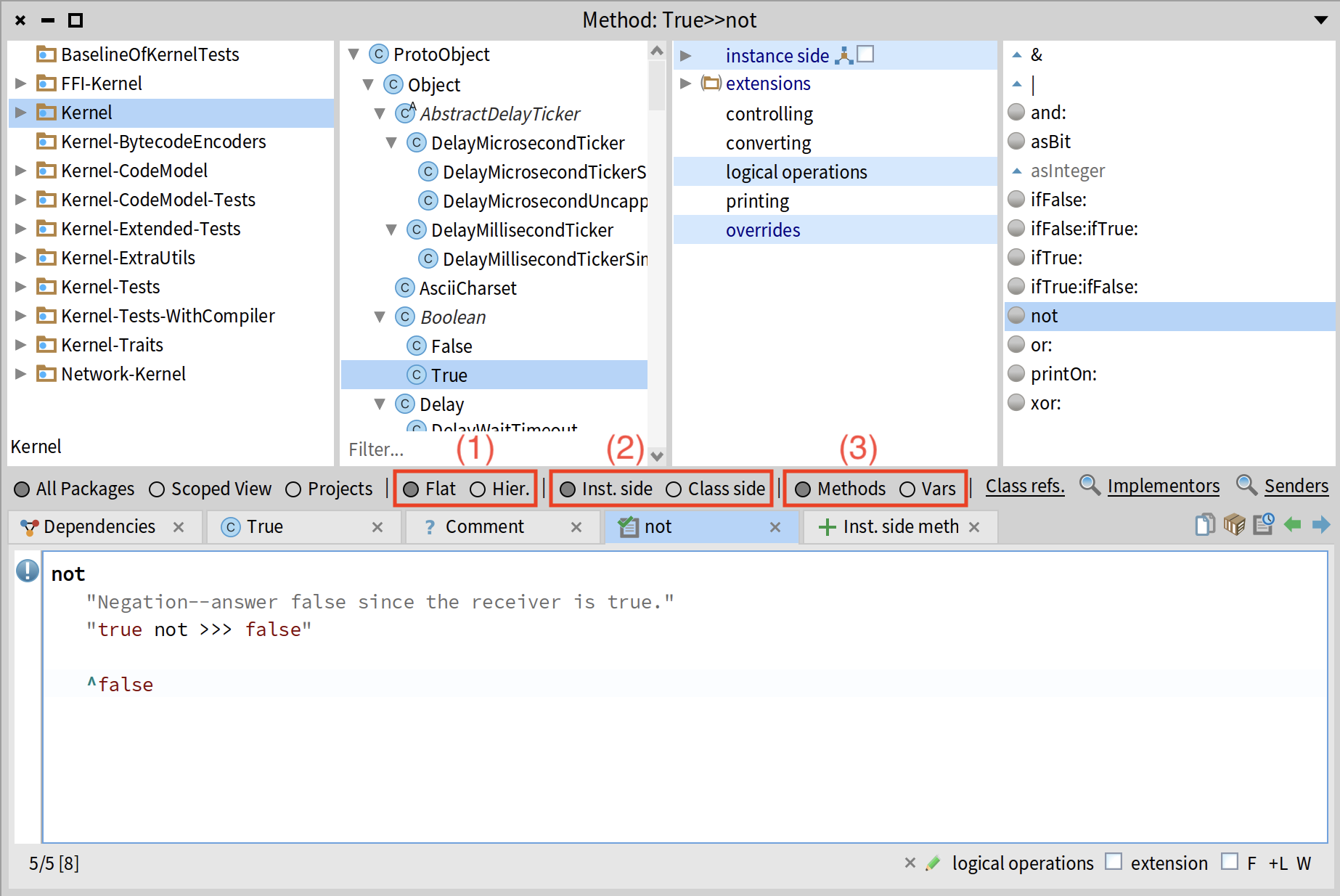 - Methods / Variables - by default, methods are selectedm which means that the third section (described above) contains protocols. If you select "Vars", the third section will display all the variables (instance side or class side depending on what you selected) as well as the variable inherited from superclasses. If you click on a variable, the fourth section will display methods that use the selected variable.