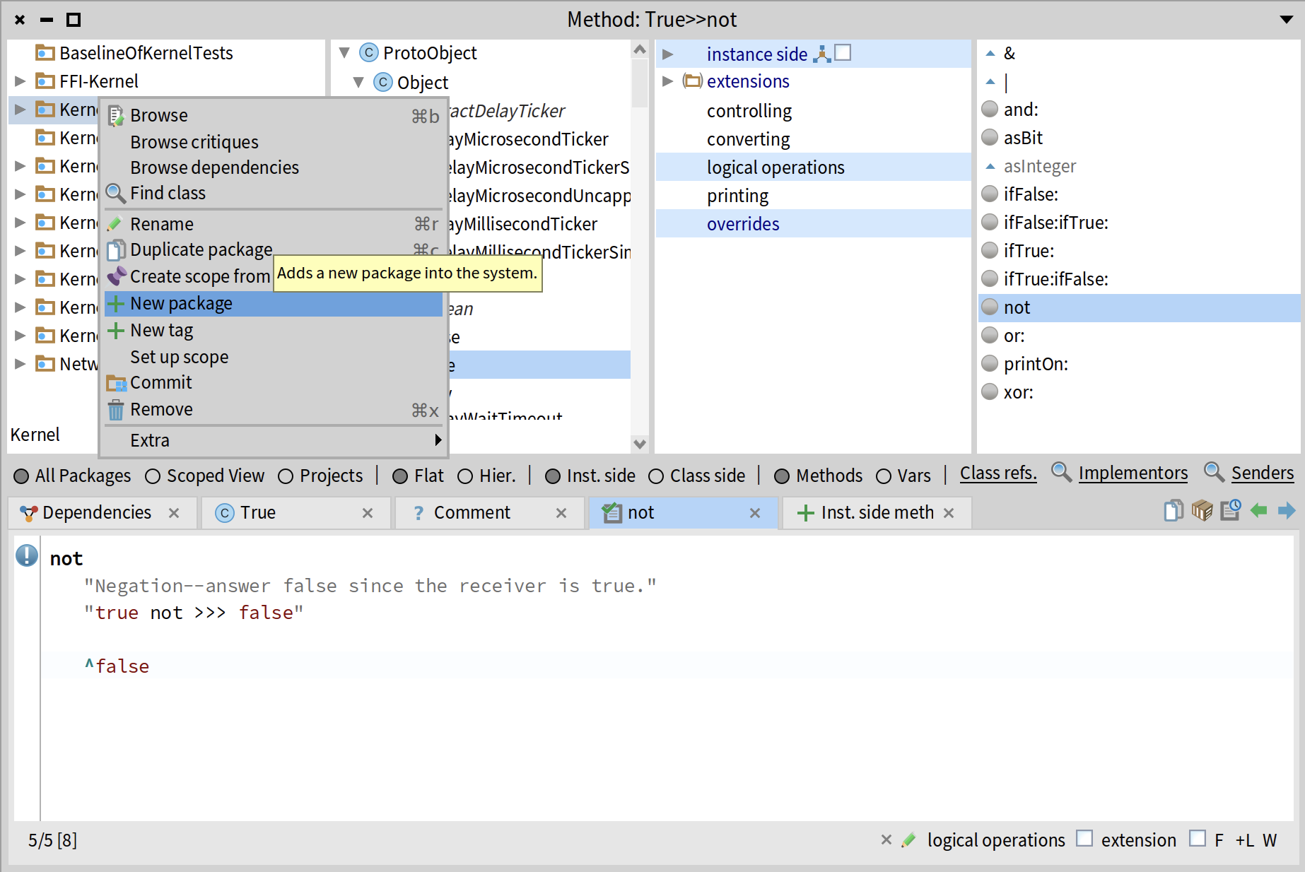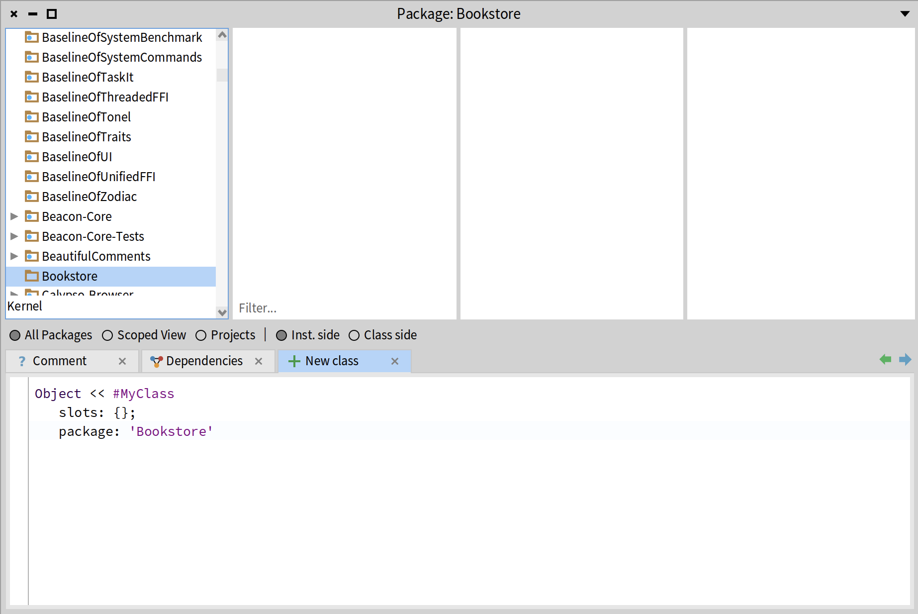 To create a new package in a SystemBrowser, right-click on any existing package and select "New package" from the menu. Type the name of your package in the dialog window and click "OK". In this example, I create a package called "Bookstore".