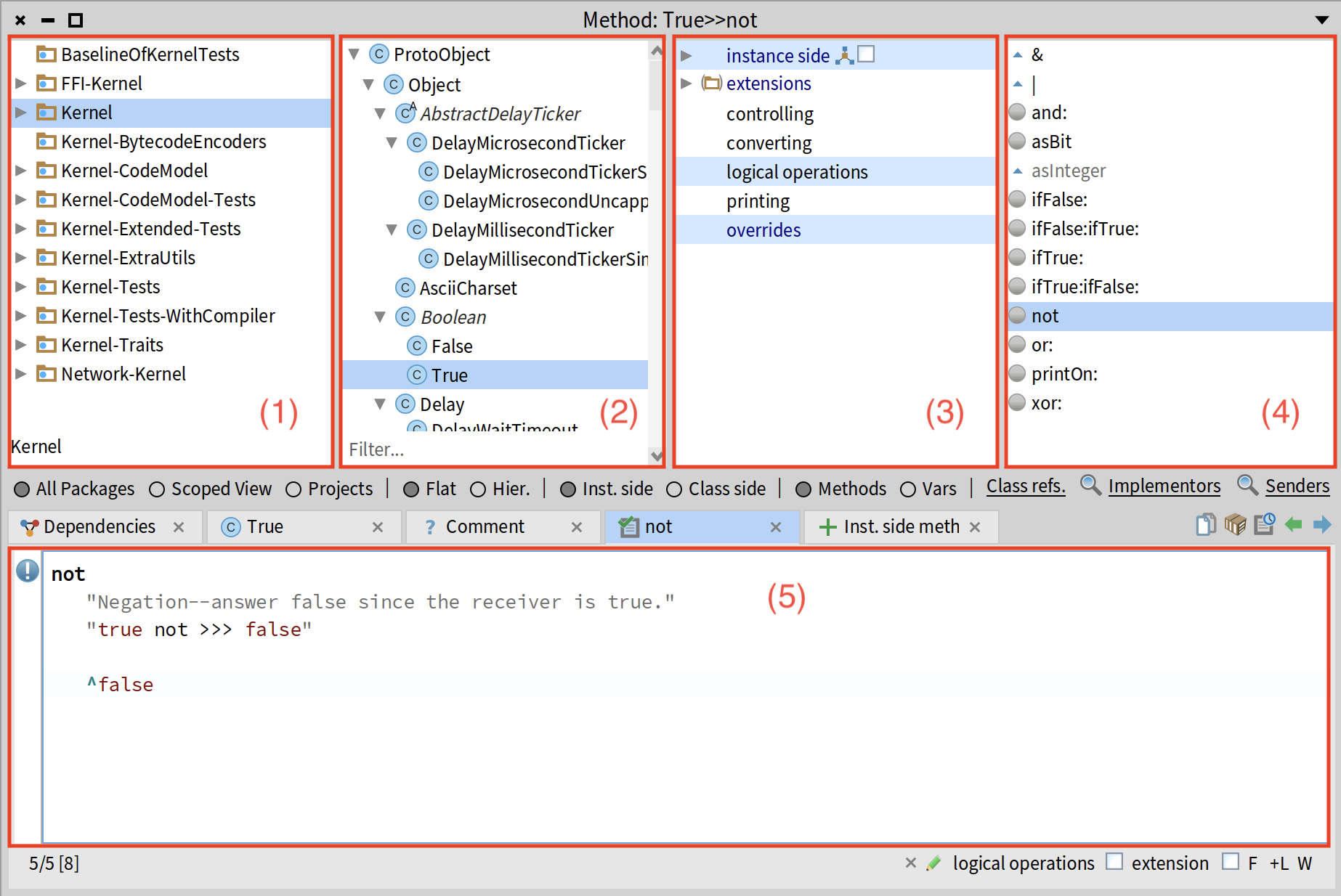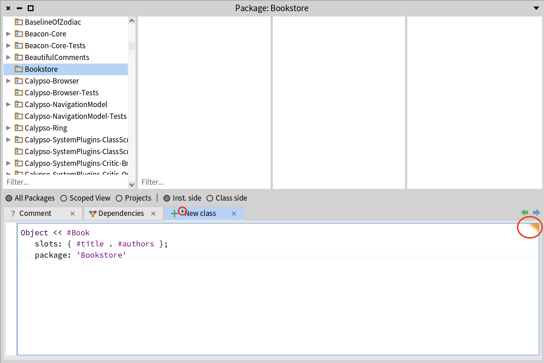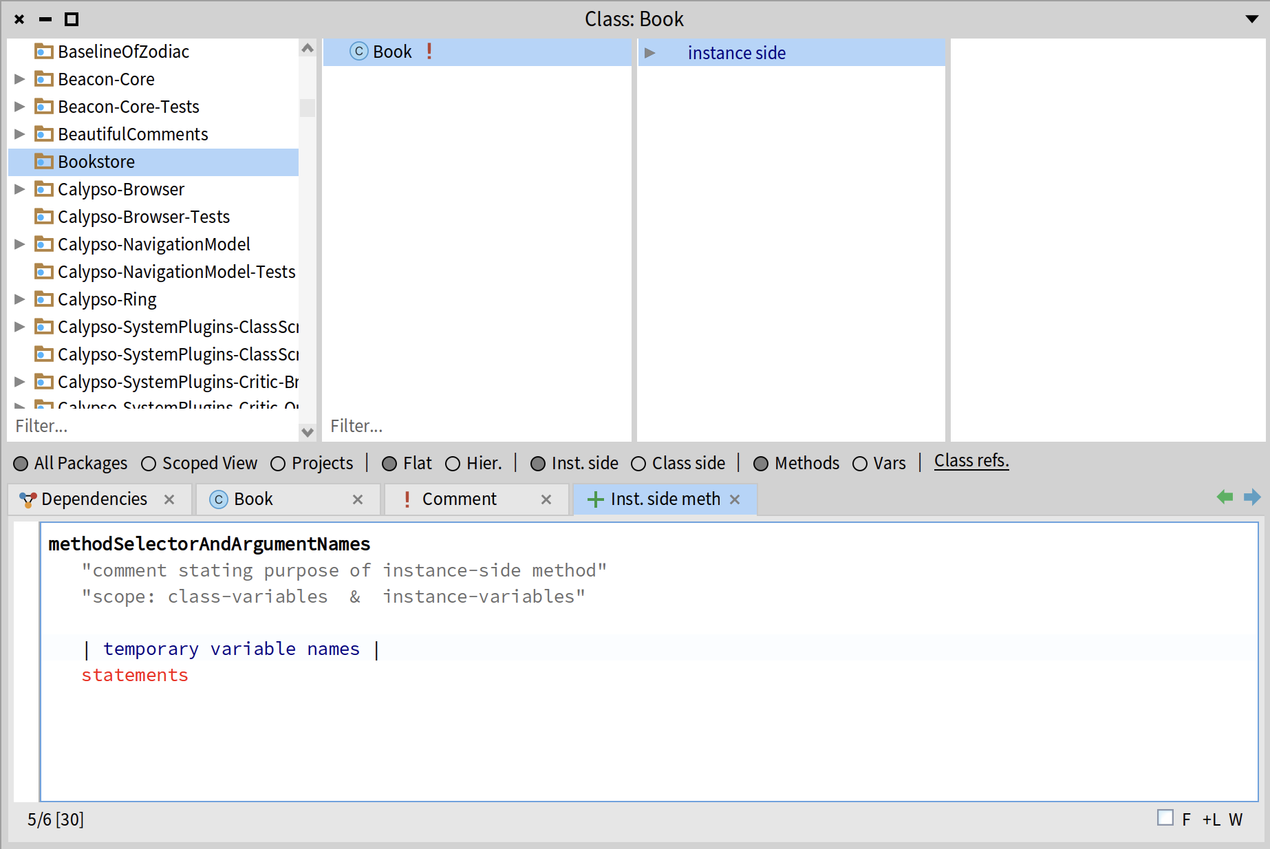 - Instance side / Class side - switch between instance side and class side variables and methods.