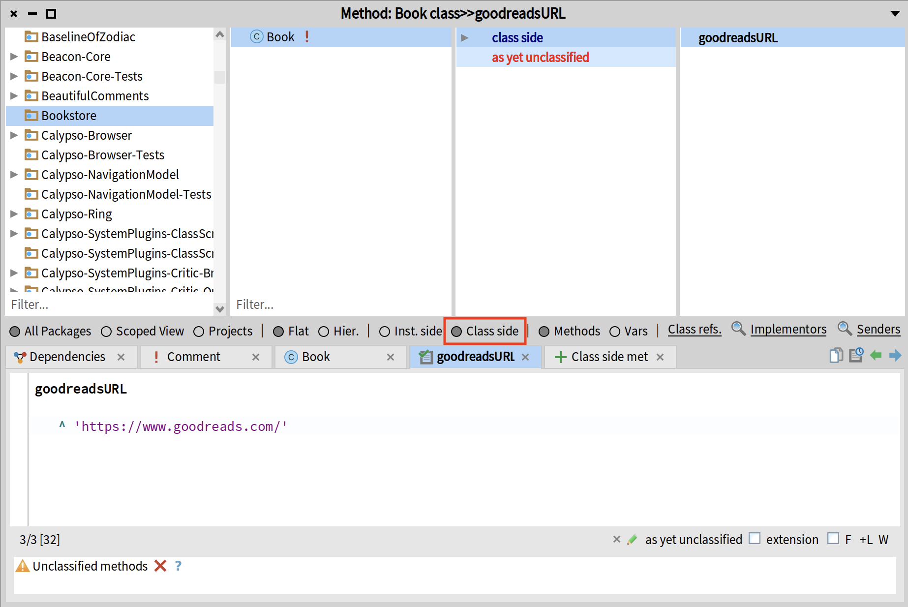 To add a new class side method, click on te "Class side" button, then click on the "class side" in the protocols section and repeat the same process as for the instance side. In this example, I will add a class side method that returns a String with a URL to goodreads.com.