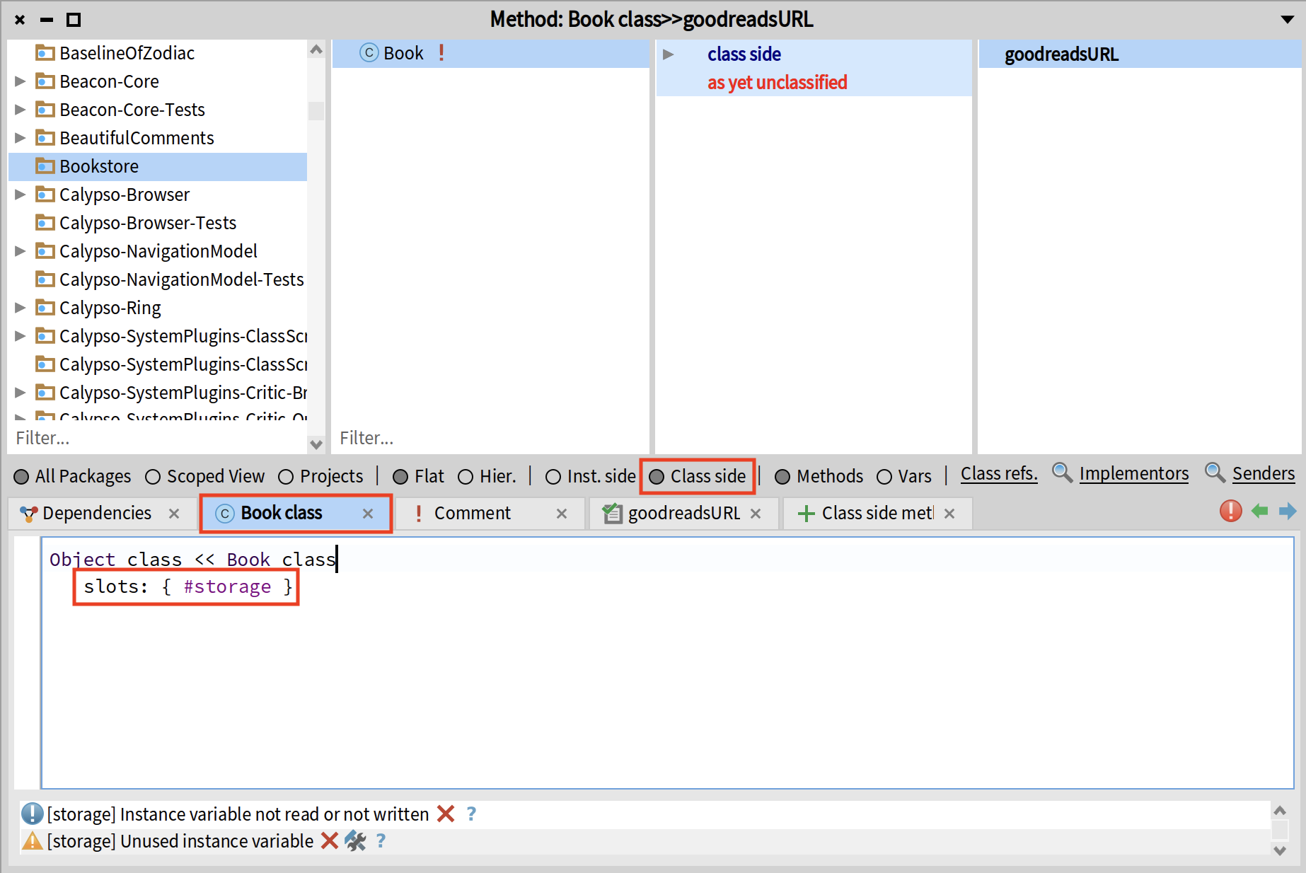 You can also add class side variables by switching to the class side view and modifying the class definition. In this example, I will add a class side varible called storage
