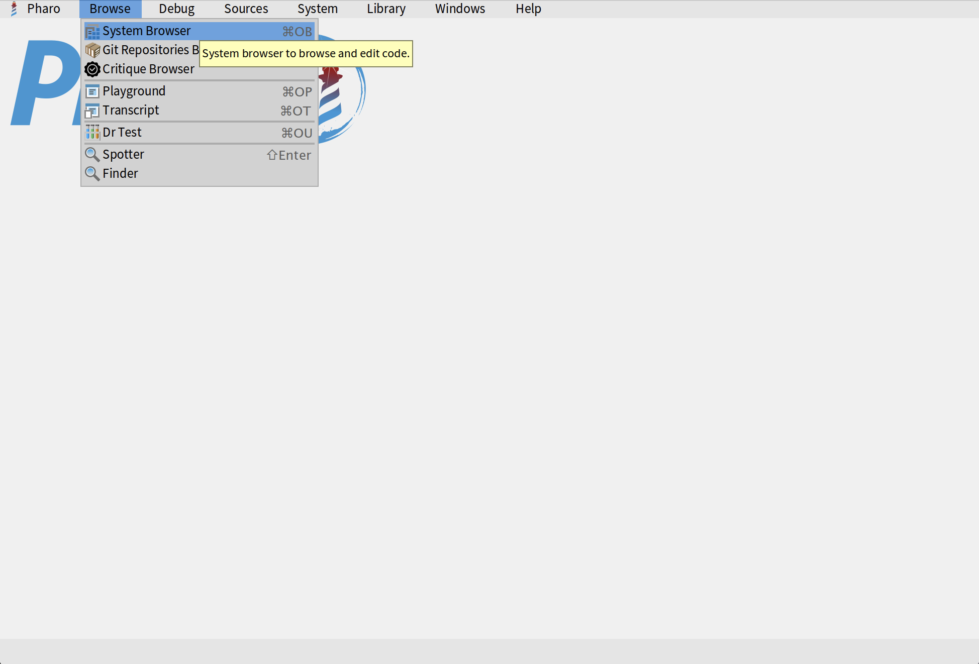 To open SystemBrowser, click on Browse > System Browser in the World Menu. You can also use the keyboard shortcut Ctrl+OB or Cmd+OB on Mac.