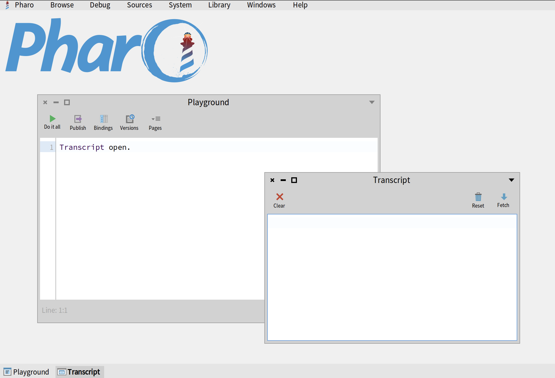 , click on Browse > Transcript in the World Menu, or ue the keyboard shortcut Ctrl+OT or Cmd+OT on Mac. Once the Transcript window opens, it might already have some logs written in it. If you are using Pharo 13 or later, you can clear your Transcript by clicking on the "Clear" button in the top-left corner. If you are on the earlier version of Pharo, execute Transcript clear