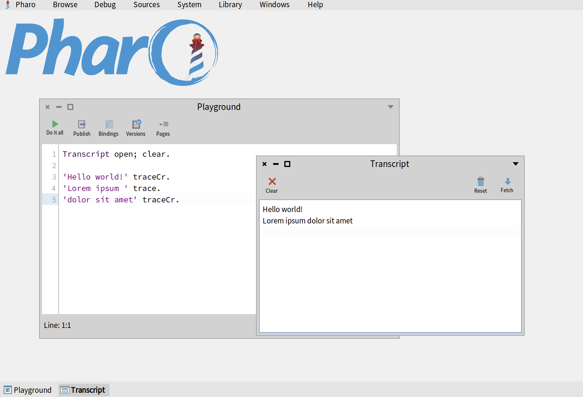 Transcript is a simple logger that can be used to display string outputs. To open the Transcript window, you can either execute (Do it) Transcript open
