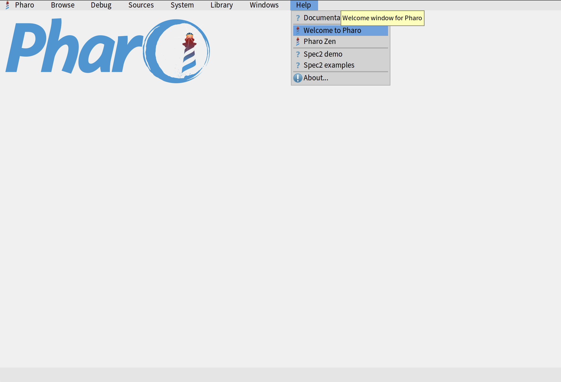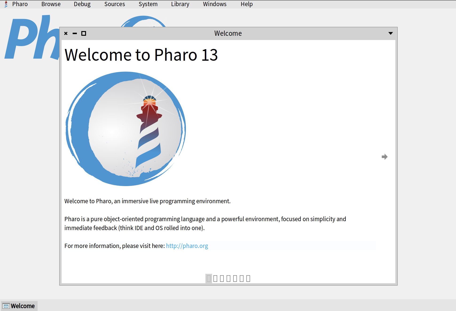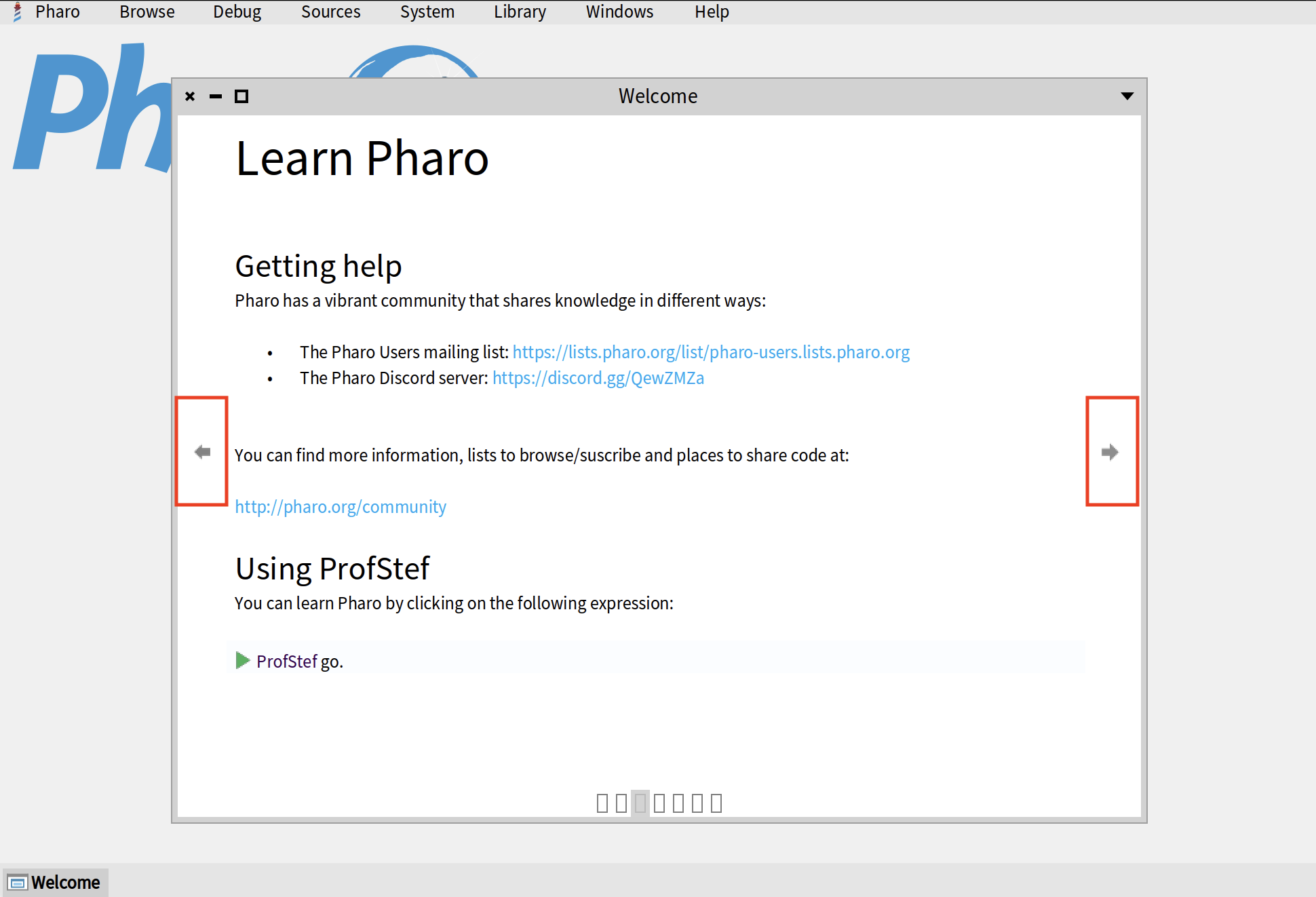 When you first open a Pharo image, you will be presented with a Welcome window. It contains a lot of useful information, including links to our learning resources, ProfStef