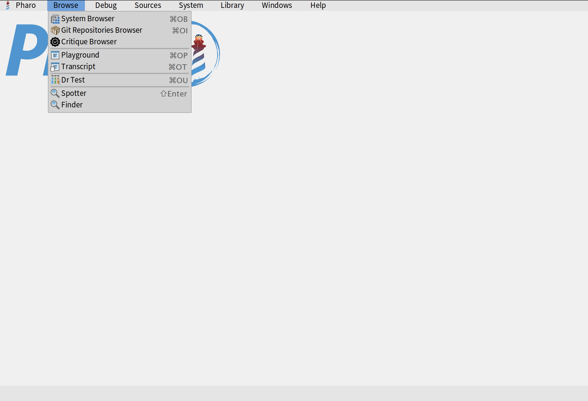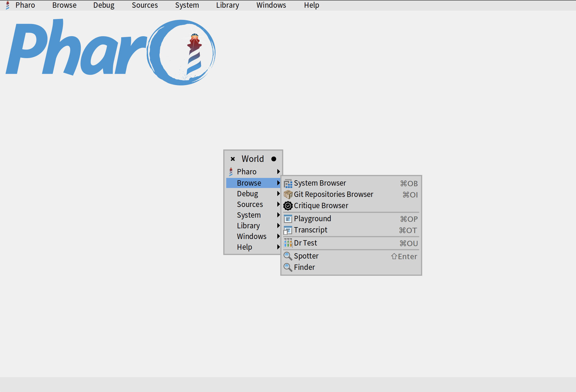 Once you close the welcome window, you will be presented with an empty environment with a Pharo logo in the top-left corner. This space is called "Pharo World". On top of your world, you wll see a menu which we call "World Menu". It allows us to access all the main tools of Pharo, manage Pharo image, access image settings, etc.